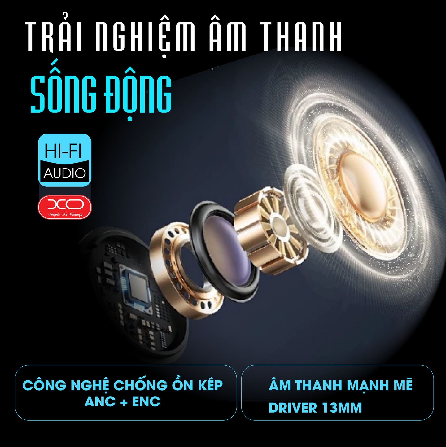 XO-G34 được trang bị chip khuếch đại âm thanh cao cấp và màng loa 13mm, tái tạo âm thanh chi tiết, chân thực như trong phòng thu. Công nghệ chống ồn chủ động ANC giảm tới 25dB, giúp bạn đắm chìm trọn vẹn trong âm nhạc mà không bị làm phiền bởi tạp âm xung quanh. Tính năng lọc tiếng ồn ENC hỗ trợ đàm thoại rõ ràng, trong khi chế độ xuyên âm cho phép nghe âm thanh môi trường để đảm bảo an toàn khi lái xe hoặc đi bộ.
