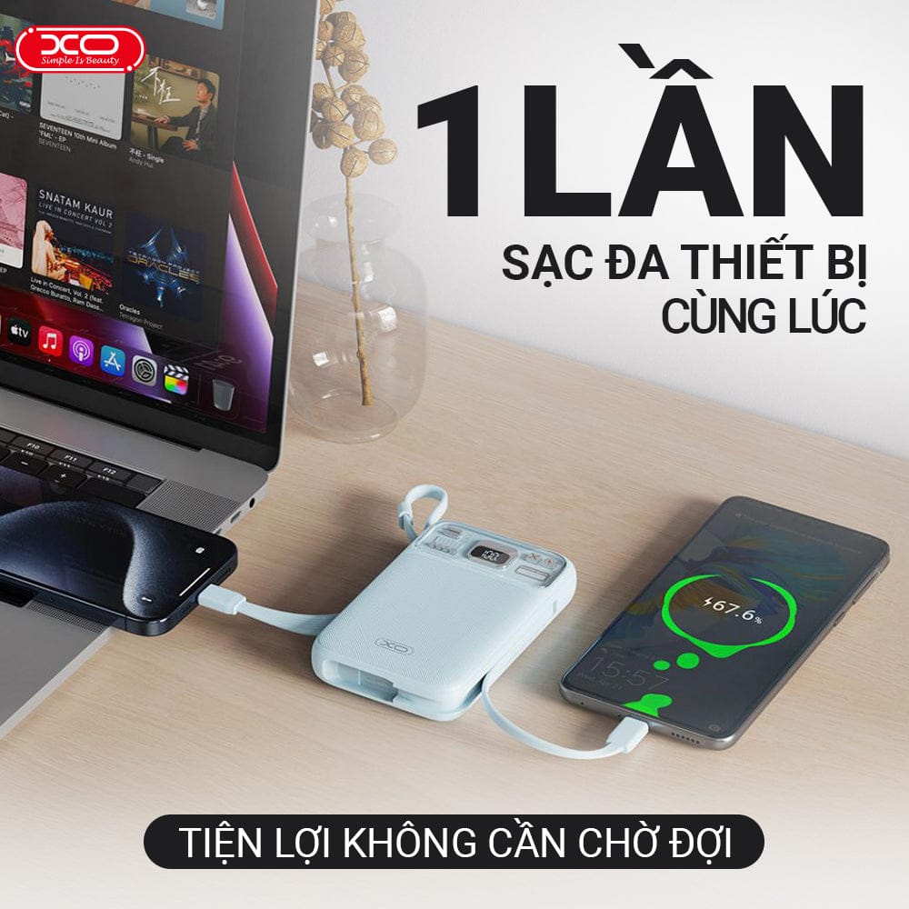 Ở văn phòng, đang đi du lịch, hoặc đơn giản là khi cả bạn và bạn bè đều sắp cạn pin – XO-PR243 giúp bạn chia sẻ mà không ảnh hưởng đến tốc độ sạc. Với 4 đầu ra (USB-A, USB-C, 2 dây tích hợp), bạn có thể sạc cùng lúc điện thoại + tai nghe + loa mini mà dòng vẫn ổn định. Không cần cãi nhau ai sạc trước nữa.