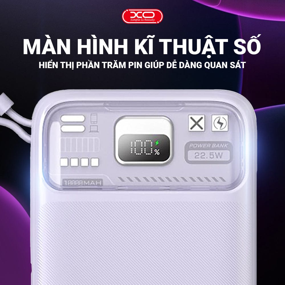 Không còn lo mơ hồ với 4 chấm LED cũ. Màn hình LED hiển thị phần trăm pin chính xác giúp bạn biết chính xác khi nào cần sạc lại pin dự phòng. Và với đầu vào USB-C hỗ trợ sạc nhanh 18W, bạn có thể nạp đầy XO-PR243 chỉ trong 3–4 giờ, cực kỳ tiện cho người dùng chủ động và bận rộn.