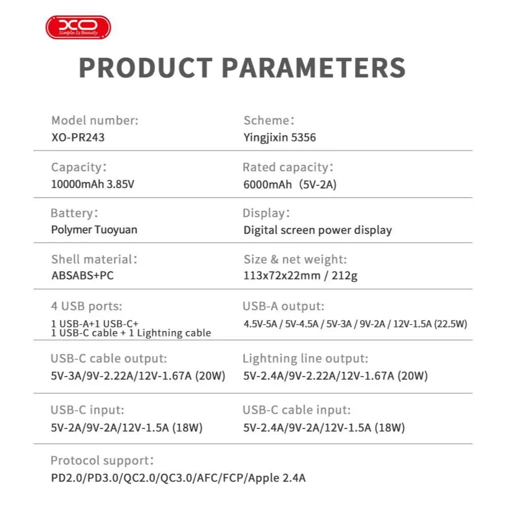 THÔNG SỐ KỸ THUẬT[XO] Sạc dự phòng XO PR243 Sạc nhanh 22.5W 10000mAh, đa năng tương thích Ap.ple, Android, có màn hình kỹ thuật số và đầu ra USB-A, USB-C Tên sản phẩm: XO – PR243 |
